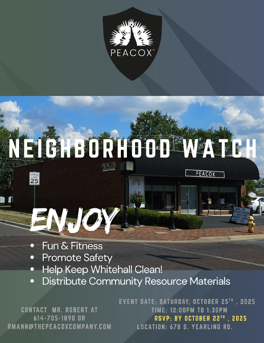October 25 @ 12:00 pm - 1:30 pm Neighborhood Watch Peacox Community Partners Building 678 S. Yearling Rd., Columbus, OH, United States Fun & Fitness Promote Safety Help keep Whitehall Clean! Distribute Community Resource Materials